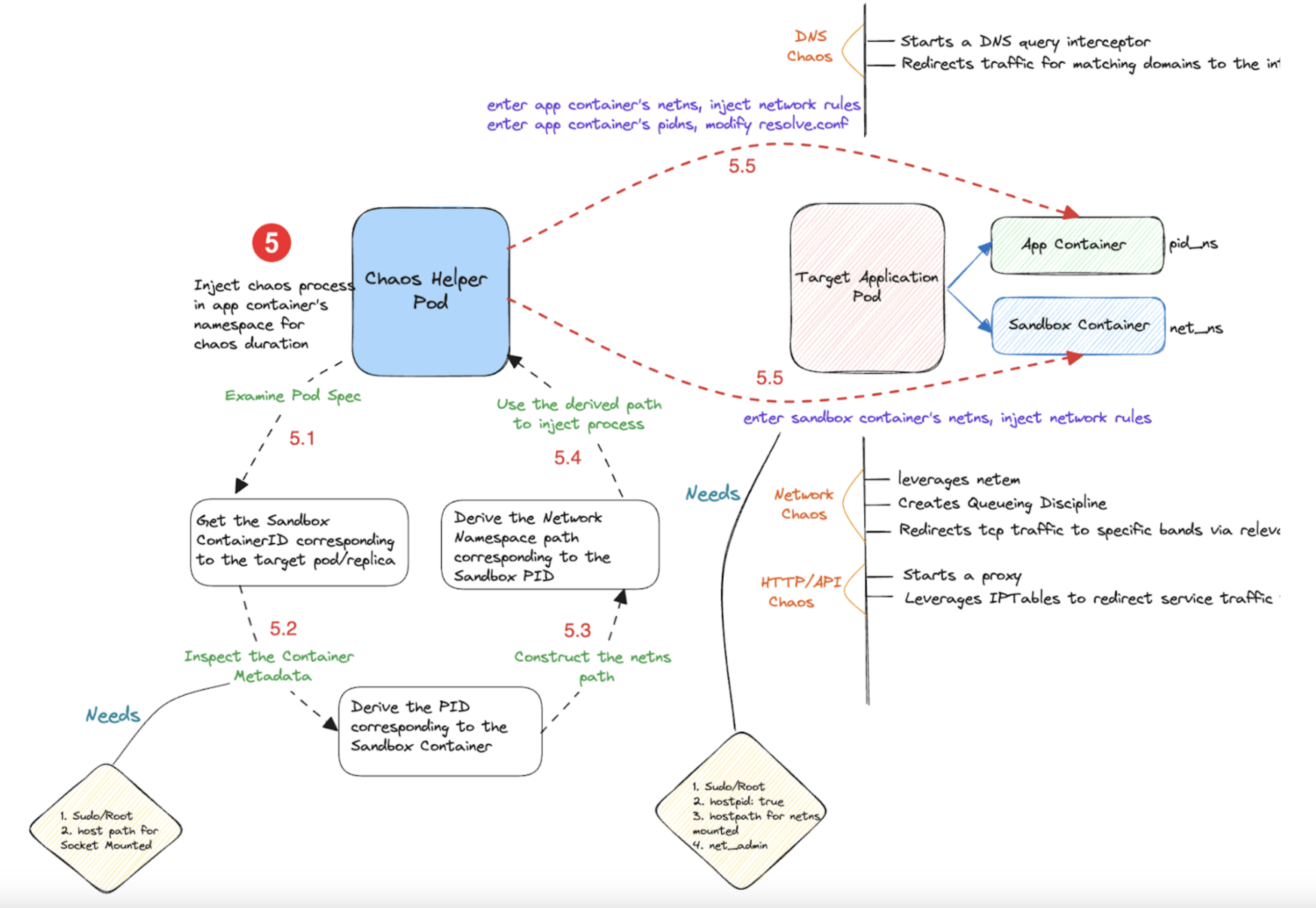 4. The chaos actions typically invoke either or a combination of the Kubernetes API, container runtime API, and cloud APIs.