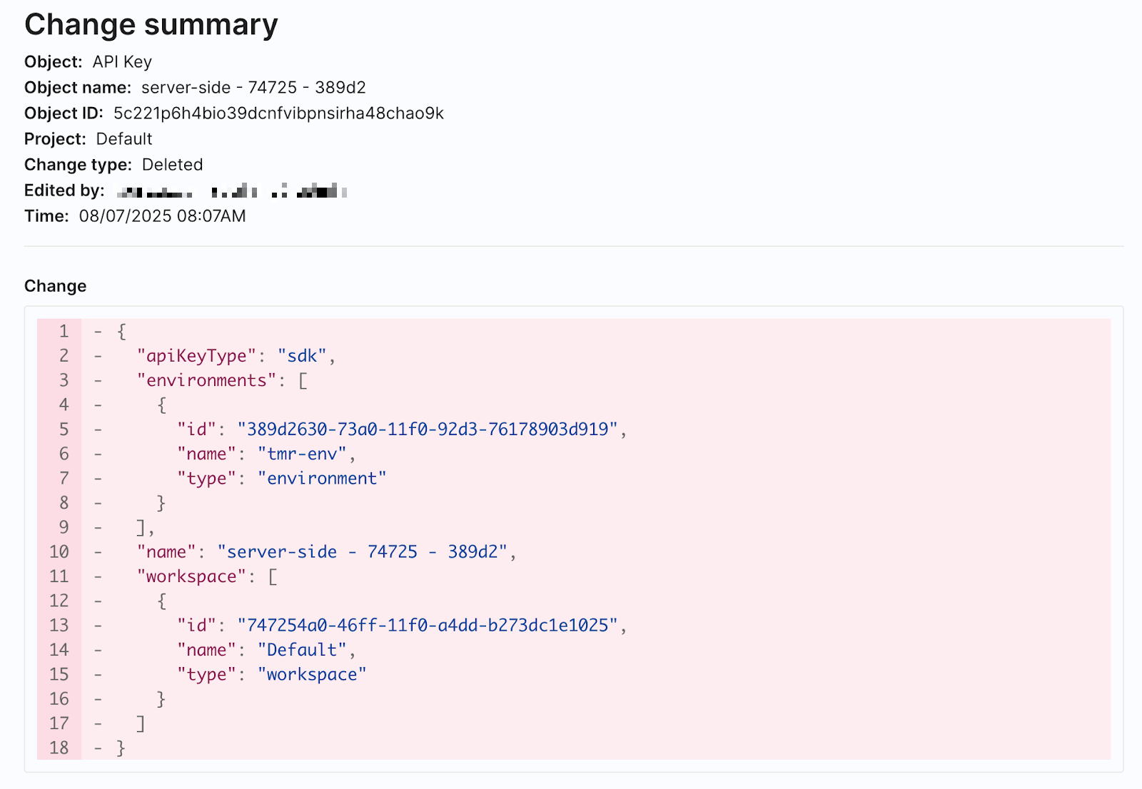 When hovering over the row for an audit log, click on the object name for that change to see more information about each update, including a diff view of what elements of the object were edited.