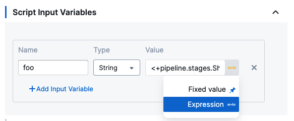 For Script Input Variables and Script Output Variables, you simply select Expression, and then paste in the Harness variable expression.