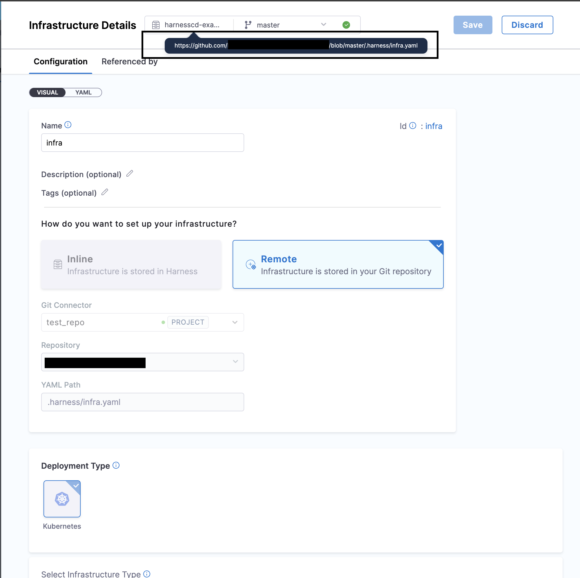 5. Harness will automatically populate the connector, repository, branch, and YAML path. The auto-population of the connector, branch, and repository is based on the environment configuration, specifically extracted from the Git repository where you've stored your environment details. You can change the connector as well as the branch.
